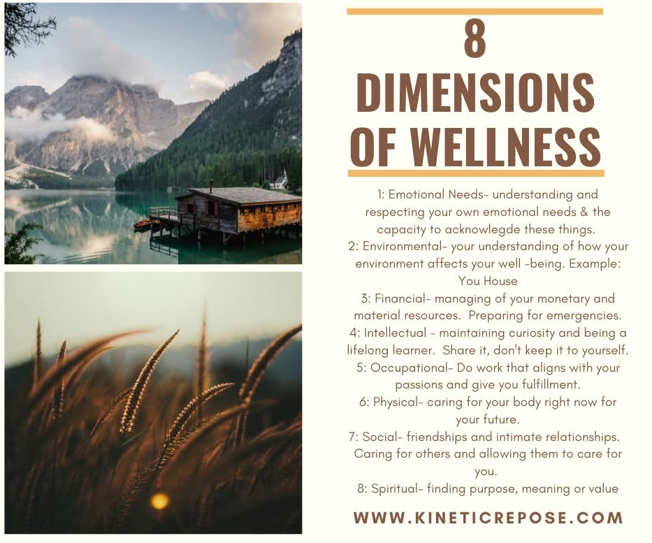 The basic idea is to evaluate what are you currently doing good at? What are you needing more attention to? The 8 Dimensions are things we need to feel at peace and happy. Here is a cheat sheet guide I made: