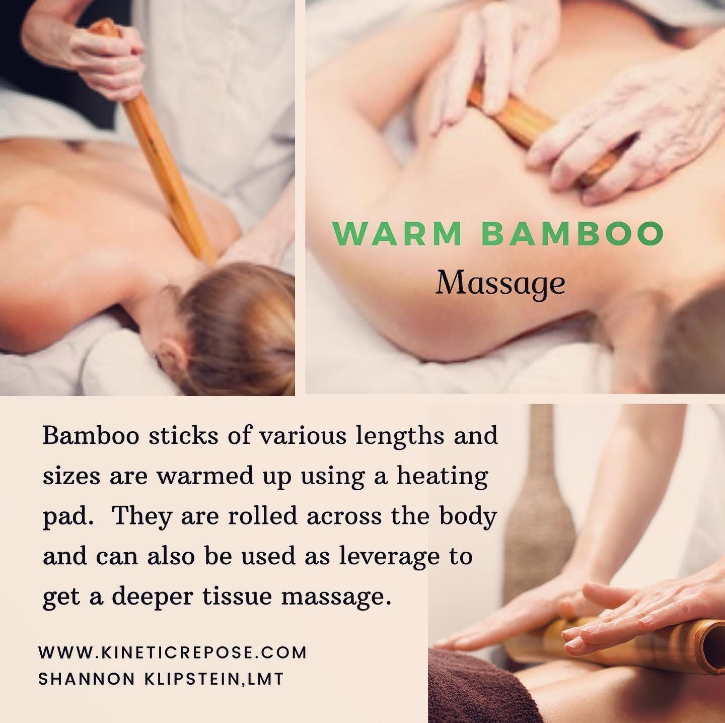 In March, I aim to utilize warm bamboo massage. I need to buy more pieces, but this goal motivates me to take action! Bamboo, a grass that heats well, is smooth and reminiscent of a rolling pin. I took the course years ago but had few clients interested. My plan is to revive it by offering a free month for people to experience it.